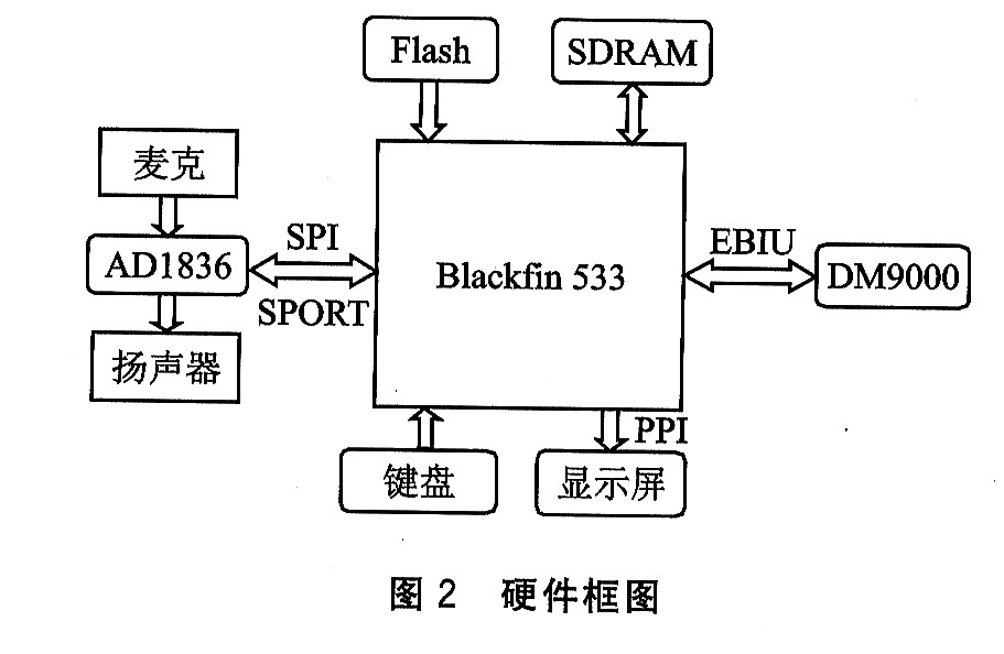 Blackfin 533為核心處理器芯片。外圍輔以ADl836實(shí)現(xiàn)語(yǔ)音信號(hào)的采集和播放;DM9000實(shí)現(xiàn)網(wǎng)絡(luò)數(shù)據(jù)包的收發(fā);TFT