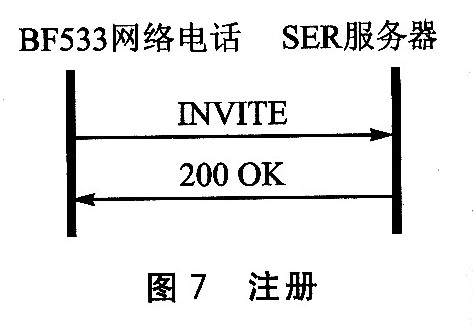 注冊(cè)過(guò)程如圖7所示。BF533網(wǎng)絡(luò)電話和SER服務(wù)器共交換了兩條消息:一條是目標(biāo)系統(tǒng)向服務(wù)器發(fā)送的REGISTER請(qǐng)求消息,另一條是服務(wù)器發(fā)送的200