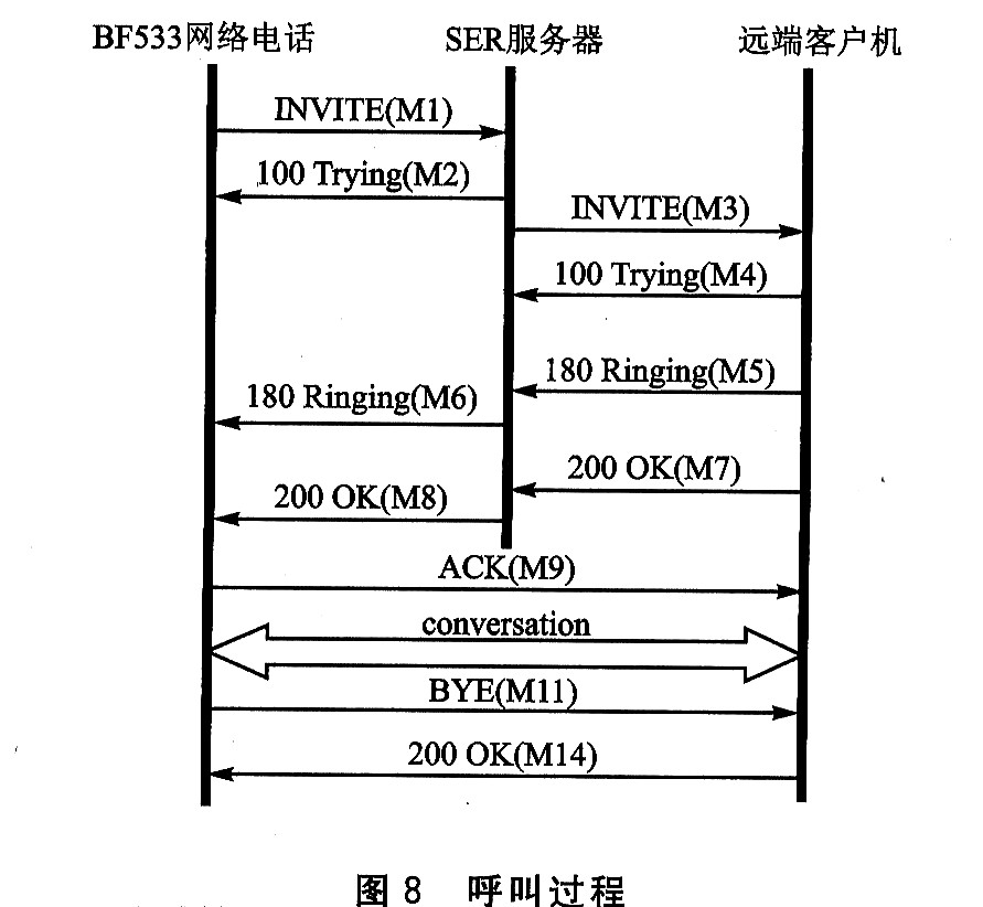 呼叫過(guò)程如圖8所示。BF533網(wǎng)絡(luò)電話(BP)先是向SER服務(wù)器發(fā)送了一條INⅥTE消息(M1),要求與遠(yuǎn)端客戶(hù)機(jī)(RC)進(jìn)行對(duì)話。SER馬上回復(fù)一條100