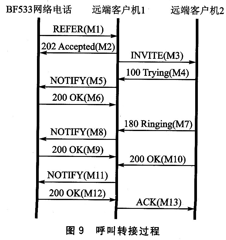 該過(guò)程是通過(guò)擴(kuò)展的SIP信令REFER來(lái)完成的,交互過(guò)程如圖9所示。當(dāng)BF533網(wǎng)絡(luò)電話要將它和遠(yuǎn)端客戶(hù)機(jī)1(RCl)的通話轉(zhuǎn)接到遠(yuǎn)端客戶(hù)機(jī)2(RC2)時(shí),BF發(fā)送REFER(M1)給RCl,該信息中Refer—To字頭標(biāo)明了RC2的URL,之后RCl回復(fù)202