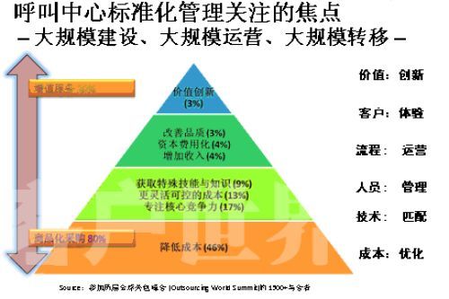 那么,對(duì)于這個(gè)尚處在”嬰兒潮”時(shí)期的產(chǎn)業(yè),我們最應(yīng)該做些什么來(lái)呵護(hù)和培育這個(gè)產(chǎn)業(yè)健康有序的發(fā)展?大家要好好呵護(hù)這個(gè)行業(yè)。如果只是強(qiáng)調(diào)“要想讓呼叫中心發(fā)展,那就需要我們多投錢(qián),這樣就能買(mǎi)許多機(jī)器,放在公司里面。規(guī)格有了,那呼叫中心就發(fā)展了!蔽矣X(jué)得這樣的說(shuō)法是對(duì)呼叫中心發(fā)展的錯(cuò)誤理解。我們這個(gè)標(biāo)準(zhǔn)是希望營(yíng)建專(zhuān)業(yè)化的產(chǎn)業(yè),整個(gè)呼叫中心產(chǎn)業(yè)的價(jià)值金字塔,這個(gè)金字塔每年在美國(guó)有一個(gè)專(zhuān)場(chǎng),就叫呼叫中心專(zhuān)場(chǎng),標(biāo)志一個(gè)產(chǎn)業(yè)成熟的金字塔是怎樣的。通過(guò)調(diào)查發(fā)現(xiàn),當(dāng)產(chǎn)業(yè)進(jìn)入成熟階段,標(biāo)準(zhǔn)化服務(wù)的第一個(gè)就是降低成本,也就是提高生產(chǎn)效益,能夠把這個(gè)產(chǎn)業(yè)細(xì)化分解,高度的模塊化進(jìn)行精細(xì)控制的時(shí)候,其他的差異化的體現(xiàn)。呼叫中心本身是不是成為企業(yè)核心競(jìng)爭(zhēng)力的一部分,或者說(shuō)越來(lái)越成熟的外包商出現(xiàn),能夠把一些企業(yè)非核心競(jìng)爭(zhēng)力加入到自己的核心競(jìng)爭(zhēng)力之上,這叫專(zhuān)業(yè)化。還有一個(gè)更加靈活可控的成本,呼叫中心的彈性從一百人到一千人,一千人到三千人的發(fā)展更加可控。還有獲得特殊技能與知識(shí),事實(shí)上呼叫中心各行各業(yè)知識(shí)都會(huì)接觸,你只有專(zhuān)著才能做得更好,本身對(duì)于呼叫中心的從業(yè)人員來(lái)說(shuō),在這個(gè)產(chǎn)業(yè)中扮演的角色不是締造一個(gè)企業(yè)的核心競(jìng)爭(zhēng)力,怎么期望從業(yè)人員掌握更多的技能和知識(shí),來(lái)指導(dǎo)更多的行業(yè)和企業(yè)。特別是在客戶(hù)導(dǎo)向上面的發(fā)展,還有在金字塔上面增加收入,分析客戶(hù)所需,讓我們更好的滿(mǎn)足客戶(hù)的需求;然后資本費(fèi)用化,從外包專(zhuān)業(yè)化領(lǐng)域帶來(lái)的變化,很多的時(shí)候最大的一筆建設(shè)是呼叫中心,基本一個(gè)中等的呼叫中心沒(méi)有500萬(wàn)以上的資金投入是不可想象的。