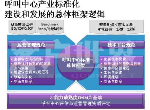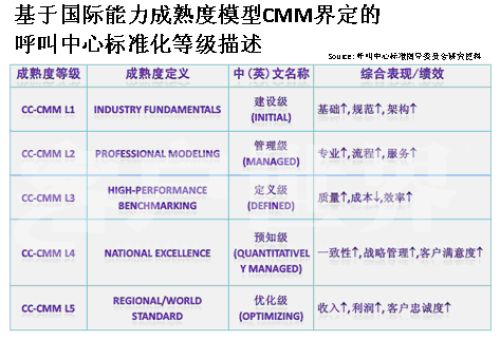 Markets)呼叫中心產(chǎn)業(yè)深入研究相結(jié)合的成果。。我在前幾年企業(yè)實(shí)施標(biāo)準(zhǔn)的時(shí)候深入研究了這套模型,這套模型對(duì)我們呼叫中心產(chǎn)業(yè)有極大的適用性,幾乎每個(gè)呼叫中心都可以在這套模型找到定位,從一個(gè)渾沌的初始過(guò)程到管理者,如果能夠建設(shè)一個(gè)持續(xù)的管控的流程到定義級(jí),如何進(jìn)行一致化管理,再到預(yù)知級(jí),幾乎每個(gè)呼叫中心從大到小,從年輕到發(fā)展一段時(shí)間都可以找到自己的定位,所以我們?cè)谠瓉?lái)的信息產(chǎn)業(yè)指導(dǎo)委員會(huì)的支持下,我們重新結(jié)合CMM模型開(kāi)發(fā)出了符合我們呼叫中心發(fā)展的一個(gè)標(biāo)準(zhǔn),我建議大家把它看成是一個(gè)模型,整個(gè)國(guó)際產(chǎn)業(yè)都定性了標(biāo)準(zhǔn),因?yàn)榇蠹叶贾繡MM模型是一個(gè)開(kāi)放性的知識(shí)體系,并不是一個(gè)封閉標(biāo)準(zhǔn)。CMM模型,首先你的呼叫中心建設(shè)要能夠符合呼叫中心的定義,不是找?guī)着_(tái)話機(jī)或?qū)ν庥袀(gè)一個(gè)客服號(hào)碼對(duì)外就能稱(chēng)為呼叫中心。