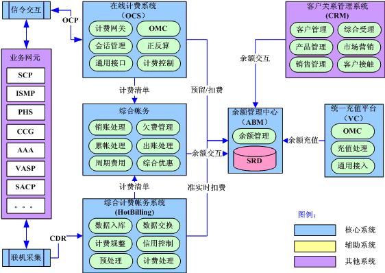 在線計費(fèi)系統(tǒng)通過實時信令交互實現(xiàn)對高風(fēng)險和高價值業(yè)務(wù)的實時計費(fèi);綜合計費(fèi)帳務(wù)系統(tǒng)通過準(zhǔn)實時話單采集實現(xiàn)對后付費(fèi)用戶的準(zhǔn)實時計費(fèi);綜合帳務(wù)系統(tǒng)實現(xiàn)全業(yè)務(wù)的綜合優(yōu)惠和帳務(wù)處理;獨立的余額管理中心實現(xiàn)對電信余額的統(tǒng)一管理,未來將成為電信的“內(nèi)部銀行”;統(tǒng)一充值平臺實現(xiàn)全網(wǎng)全業(yè)務(wù)的統(tǒng)一充值支付。