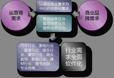 基于這個需求,那么運營商更需要的是針對行業(yè)版的解決方案,有許多的行業(yè)正在期待獲得這樣的商業(yè)信息化平臺,包括:汽車行業(yè)、家電行業(yè)、服裝行業(yè)、娛樂行業(yè)、餐飲行業(yè)、商業(yè)賣場、教育行業(yè)、建材行業(yè)、圖書出版、專業(yè)傳媒等。