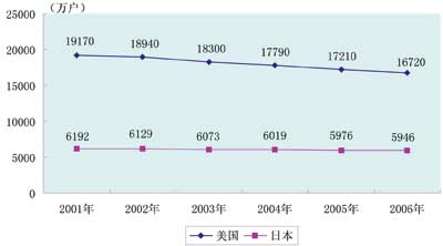 關(guān)于固定電話受沖擊的現(xiàn)象,美國比日本更加突出,這是因?yàn)槊绹蟮耐ㄐ殴境颂峁╇娫、電視和高速上網(wǎng)捆綁服務(wù)外,基本上不提供IP電話(普通電話機(jī)經(jīng)本地市話交換機(jī)以及網(wǎng)關(guān)進(jìn)入因特網(wǎng))和VoIP電話(普通電話機(jī)經(jīng)電話連接器進(jìn)入因特網(wǎng))。美國衛(wèi)生統(tǒng)計(jì)中心公布的數(shù)據(jù)顯示,2007年下半年,美國只有移動電話而沒有固定電話的家庭比例達(dá)到15.8%,這一比例在2004年同期只有6.1%,大約2%的美國家庭沒有電話。