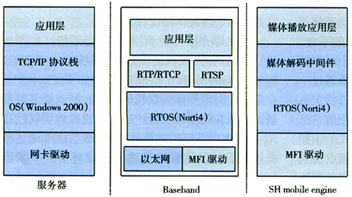 軟件平臺:SH-7300實(shí)時(shí)操作系統(tǒng)(Norti4),MPEG-4audio/videoencoder/decodermiddleware,流媒體協(xié)議棧(如圖2所示)。