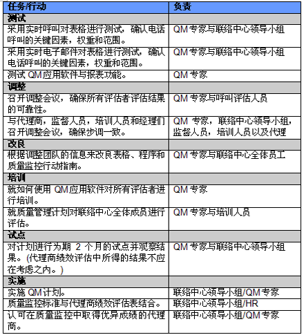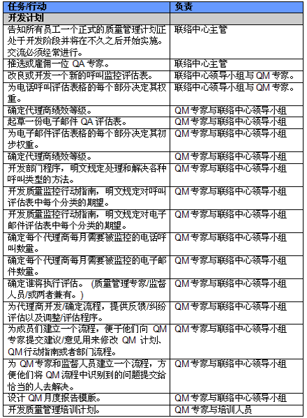 4. 開展項(xiàng)目交流。管理人員必須就新的或者修繕后的QM計(jì)劃與代理商進(jìn)行交流。QM的成功與否與代理商的合作密不可分,如果代理商受邀參與新QM計(jì)劃的開發(fā)并且所有改變都在雙方之間明確交流過,那么成功的機(jī)會也將大大提高。交流的內(nèi)容應(yīng)包括為什么要開發(fā)這樣一個計(jì)劃,它的作用和職責(zé)是什么,它對代理商會產(chǎn)生哪些影響(對于他們的評估和提升)以及它能帶來哪些好處。幫助代理商認(rèn)識到QM計(jì)劃積極的一面很重要,因?yàn)橹挥羞@樣才能讓他們看到QM不僅僅是管理人員用來告訴他們做錯了事情的一種手段。讓聯(lián)絡(luò)中心全體員工參與QM計(jì)劃的開發(fā)能夠建立他們對該計(jì)劃的支持,提高接受度的同時避免不知所措。這對聯(lián)絡(luò)中心剛剛嶄露頭角,QM計(jì)劃還未全面鋪開的中國市場而言尤為重要。