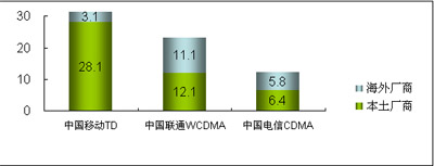 在3G設備市場方面,2008年,中國的WCDMA、CDMA2000與TD-SCDMA三種3G網(wǎng)絡在建設上有不同的進展。中國移動啟動了第二階段的TD-SCDMA網(wǎng)絡建設、中國電信啟動了涉及面向81個重點城市的CDMA全網(wǎng)招標、而中國聯(lián)通也開始7個城市建立WCDMA試驗網(wǎng)絡的建設工作。而在所有的網(wǎng)絡建設中,中國本土廠商借3G契機迅速提升競爭力,占據(jù)了3G網(wǎng)絡建設大部分市場份額。
