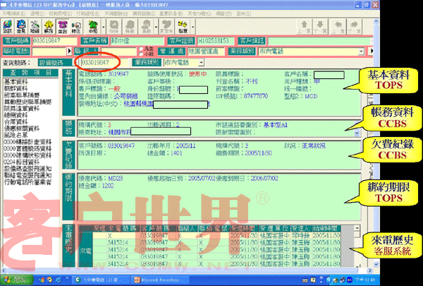我們推動(dòng)「CPEP客服流程提升計(jì)劃」的重點(diǎn)是在IVR流程中就請(qǐng)客戶自行輸入其欲查詢或辦理的電話號(hào)碼,同時(shí)客服系統(tǒng)便先透過EAI到后端信息系統(tǒng),查詢出該號(hào)碼的核心數(shù)據(jù)(含基本、帳務(wù)、欠費(fèi)記錄、來電歷史等),當(dāng)客服人員應(yīng)答時(shí)客服系統(tǒng)便立即將這些核心數(shù)據(jù)顯示在屏幕上(如圖一),客服人員便可立即掌握此客戶之相關(guān)資料,CPEP如此改善后平均的服務(wù)效率提升了11%。