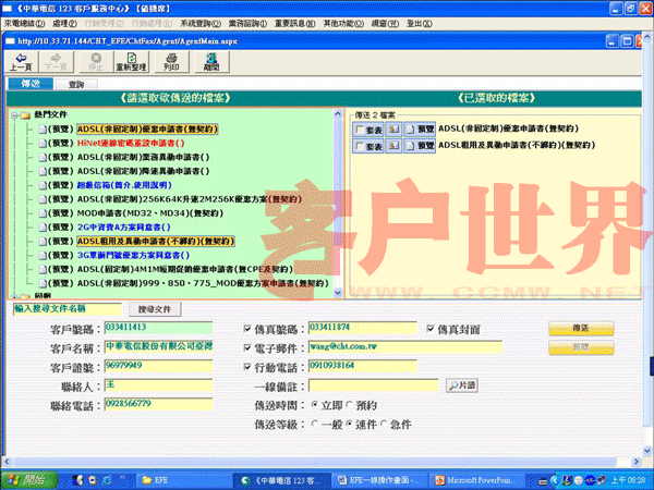 EFE第一步先將所有的窗口、文件與數(shù)據(jù)轉(zhuǎn)為電子化的檔案,當(dāng)需要傳送書面文件給客戶時(shí),客服人員可立即在在線點(diǎn)選以傳真或電子郵件將文件傳給客戶(如圖二),傳送成功后并立即以SMS通知客戶。當(dāng)客戶反饋數(shù)據(jù)回來時(shí),EFE會(huì)自動(dòng)接收并存盤,接收成功后EFE則會(huì)立即發(fā)送SMS訊息給客戶安心,而且所有送出與接收文件都有完整記錄可共管理、追蹤與處理。