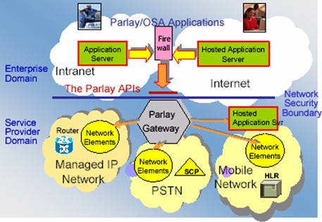 從圖中可以看到,OSA的基本思路是,把電信網絡的服務抽象成為一個特定的接口。這個接口的名稱現(xiàn)在被我們稱為Parlay。建立在OSA基礎之上的服務可以利用Parlay這個接口很容易的使用電信網絡中的服務而不用去關心這些接口是如何實現(xiàn)的。例如我們的一個多媒體服務希望給一個用戶發(fā)送一條短信以通知他某個事件的發(fā)生,那么這個服務需要做的是告訴Parlay這個接口需要給哪個用戶發(fā)送什么樣的內容的信息,而不需要了解在移動網絡中原來是使用SMPP這樣的協(xié)議來實現(xiàn)短信的傳送的,又或者也不用去考慮在一個IP網絡中我們可以用SMTP這樣的協(xié)議來實現(xiàn)他。
