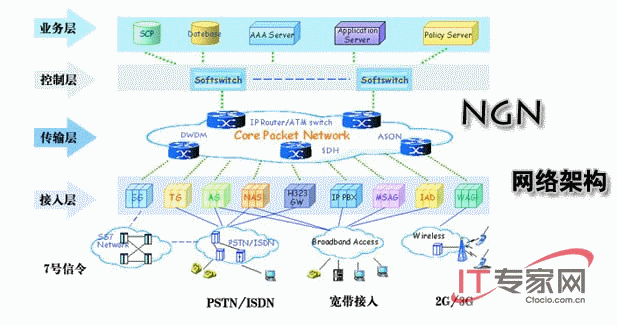 下一代網(wǎng)絡(luò)(NGN)是指以軟交換為代表,IMS為核心框架,能夠?yàn)楣婌`活提供大規(guī)模視訊話音數(shù)據(jù)等多種通信業(yè)務(wù),以分組交換為業(yè)務(wù)統(tǒng)一承載平臺(tái),傳輸層適應(yīng)數(shù)據(jù)業(yè)務(wù)特征及帶寬需求,與通信運(yùn)營(yíng)商相關(guān),可運(yùn)營(yíng)、維護(hù)、管理的通信網(wǎng)絡(luò)。