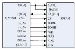 SDRAM的CLK信號由MPC860T的輸出時鐘CLKOUT驅(qū)動,/WE、/RAS和/CAS信號分別由UPMA的GPLA1~GPLA3產(chǎn)生。SDRAM的A10引腳要復(fù)用于SDRAM的刷新控制,因而必須與GPLAO相連(由于不方便連線圖中未畫出),因為MPC860T的GPLAO可以通過編程實現(xiàn)控制信號與地址信號的復(fù)用。MT48LC4M16A2內(nèi)部有12條行地址和8條列地址,行地址為高位地址,列地址為低位地址,而外部僅有12條地址信號A0~A11。這就需要對UPM對地址進(jìn)行復(fù)用。MPC860T支持內(nèi)部地址復(fù)用,可以通過UPM的RAM字中的AMX位進(jìn)行配置,同時將OR寄存器中的SAM位同時進(jìn)行配置。相關(guān)寄存器配置為:BR2=Ox0000081,說明:32位寬,無奇偶校驗,無寫保護(hù),選擇UPMA,基地址00000000;OR2=OxFF000A00,說明:16Mbyte容量,地址復(fù)用。