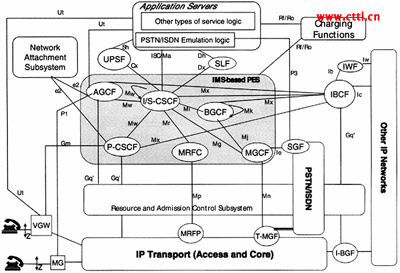 在ETSIES282007中,主要給出了IMS子系統(tǒng)所包含的功能實(shí)體,IMS子系統(tǒng)相關(guān)的功能實(shí)體之間的內(nèi)部接口以及這些功能實(shí)體和IMS子系統(tǒng)外部功能實(shí)體之間的接口。圖1是TISPAN