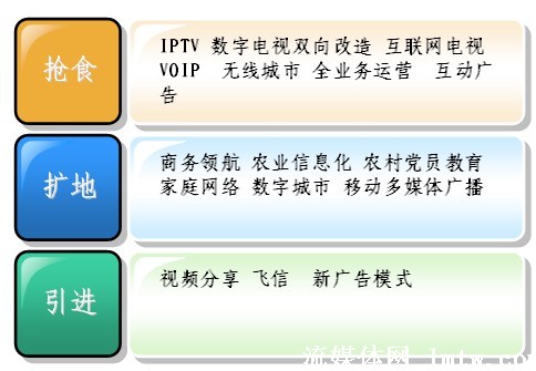 從廣義上講,廣電、電信、互聯(lián)網(wǎng)都屬于信息行業(yè),現(xiàn)在都面臨著自己在增長中遇到的問題,也就是滯漲。滯漲逼迫大家必須去轉(zhuǎn)型,轉(zhuǎn)型現(xiàn)在有三種方式,一個(gè)是搶,一個(gè)是擴(kuò),一個(gè)是引進(jìn)。從最近會(huì)議上來看,目前大家對(duì)搶食比較感興趣,畢竟有現(xiàn)成的一碗紅燒肉已經(jīng)做好了,對(duì)后面兩個(gè),相對(duì)來說談得還比較少,因?yàn)楹竺鎯蓚(gè),需要引入一些創(chuàng)新的技術(shù),引入創(chuàng)新的思維。