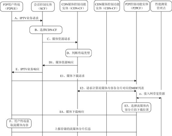 本架構(gòu)的最大特點(diǎn)是結(jié)合CDN和NGN架構(gòu)(注:為了簡(jiǎn)化沒有給出詳細(xì)的NGN相關(guān)控制實(shí)體,架構(gòu)中只體現(xiàn)了會(huì)話控制實(shí)體和資源接納控制功能實(shí)體),在此基礎(chǔ)上引入P2P相關(guān)功能,包括P2P控制實(shí)體和P2P用戶終端。通過對(duì)基于NGN的IPTV架構(gòu)和CDN架構(gòu)的改進(jìn),使該架構(gòu)既能夠具備電信網(wǎng)中網(wǎng)絡(luò)資源可控、可管的特征,又通過引入P2P具備了一定的靈活性和自組織能力,將電信網(wǎng)和互聯(lián)網(wǎng)技術(shù)的優(yōu)勢(shì)均集中在了一起。