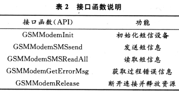 短信貓通過RS 232串口與計(jì)算機(jī)連接,系統(tǒng)需通過接口驅(qū)動短信貓發(fā)送或讀取短信,各接口函數(shù)說明見表2。