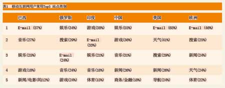 根據(jù)尼爾森2008年一季度的研究結(jié)果,移動(dòng)互聯(lián)網(wǎng)用戶使用的業(yè)務(wù)集中于五大類,歐美地區(qū)用戶使用習(xí)慣比較接近,而中國用戶與歐美用戶存在較大差異。具體見表1。