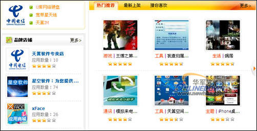 天翼空間應用商城由四川電信與華為公司合作建設,并于9月1日公測上線。天翼空間應用商城分為游戲、主題、娛樂、生活、通訊、閱讀、旅行、商務、教育、財經(jīng)、工具等11個類別,超過500款應用產(chǎn)品,入駐店鋪100余家,并引入5家品牌店鋪。目前,天翼空間已與百度、UCWEB、360安全衛(wèi)士,大頭網(wǎng)、3G門戶網(wǎng)等多家國內(nèi)知名IT企業(yè)合作開店。