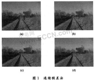 綜合考慮以上四種背景提取方法,本文采用結(jié)合多幀圖像平均法和連續(xù)幀差法這兩種方法來進行視頻序列背景的提取。考慮到運動目標的多樣性,有目標經(jīng)過視場而引起的變化長時間內(nèi)可忽略不計。多幀圖像平均法時將運動目標看作為噪聲,用累加平均的方法消除噪聲,利用目標運行一段時間的序列圖像進行平均而得到視場背景圖像。連續(xù)幀差算法是通過當前幀的圖像與前一幀圖像的差值找到運動區(qū)域,對運動區(qū)域的背景保持不變,而非運動區(qū)域的背景則用當前幀進行更新,經(jīng)過一段時間的迭代便可提取出背景。兩種方法的結(jié)合可以很好地彌補各自的缺點,能夠適應(yīng)鐵路沿線周邊環(huán)境的要求,對存在運動目標的背景能夠提取出質(zhì)量較高的背景圖像。具體過程如下: