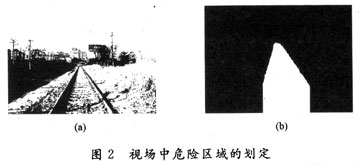 圖像二值化后的結(jié)果如圖2(a)所示,得到的最終結(jié)果如圖2(b)所示。從兩幅圖像的對比可以看出,圖像經(jīng)過一系列處理后,基本標定了危險區(qū)域。對于得到的圖2(b),圖中白色的區(qū)域為鐵道雙軌內(nèi)部即設(shè)定的危險區(qū)域。應(yīng)用此種方法得到的結(jié)果圖像在光照條件充足情況下能夠得到更好的效果,不適用于光照條件不足和夜間的危險區(qū)域標定。