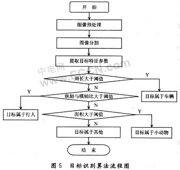 根據(jù)運動目標的分類可知,車輛的周長是最長的,所以首先直接判斷圖像中運動目標的周長,如果大于某一設(shè)定好的閾值,則可輕易判斷出視場中目標屬于車輛。余下的目標中,行人比小動物的縱橫軸比值大,設(shè)定縱橫軸比閾值,據(jù)此可以判斷出目標屬于行人。最后將設(shè)定一個面積閾值,面積大于此閾值則可判斷目標屬于小動物,否則目標屬于其他一些環(huán)境的干擾。