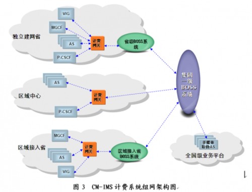 為了降低設(shè)備投資風(fēng)險,CM-IMS在部署初期采用分省和區(qū)域中心相結(jié)合的組網(wǎng)方案,并設(shè)置全國級業(yè)務(wù)平臺。CM-IMS計費系統(tǒng)組網(wǎng)架構(gòu)如圖3所示。