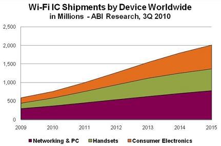 Wi-Fi技術(shù)現(xiàn)已被用于幾乎所有筆記本和上網(wǎng)本、智能電話和游戲設(shè)備。電話、音頻播放器、打印機(jī)、機(jī)頂盒以及其他消費(fèi)類電子設(shè)備對(duì)Wi-Fi技術(shù)的采用率也在不斷增加,來(lái)自Wi-Fi聯(lián)盟和多家調(diào)研機(jī)構(gòu)的數(shù)據(jù)印證了這種市場(chǎng)增長(zhǎng)趨勢(shì)。2009年,僅在中國(guó)銷售的具備Wi-Fi功能的筆記本電腦就達(dá)到800萬(wàn)臺(tái),全球Wi-Fi設(shè)備認(rèn)證數(shù)量則增加了約50%,消費(fèi)類電子設(shè)備和電話數(shù)量增加了100%以上。截止到2010年7月,消費(fèi)類電子設(shè)施與電話類產(chǎn)品的認(rèn)證數(shù)量已經(jīng)超過(guò)了2009年全年數(shù)量,預(yù)計(jì)全年售出約8億臺(tái)Wi-Fi設(shè)備。
