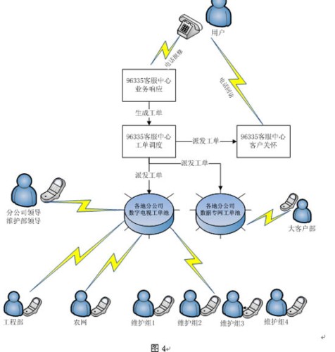用戶致電96335呼叫中心的工單,由96335的中心處理席根據(jù)工單反應(yīng)的細(xì)節(jié)分派到各個(gè)服務(wù)站,移動實(shí)時(shí)工作流根據(jù)預(yù)先設(shè)定的工作流程和條件流轉(zhuǎn)到相關(guān)的處理人,服務(wù)人員在移動智能手機(jī)終端的客戶端軟件可以查詢他所要辦理的工單,已經(jīng)完成辦理的工單,根據(jù)工單的詳細(xì)內(nèi)容上門為用戶解決問題,并通過客戶端軟件填寫問題處理的結(jié)果。由移動實(shí)時(shí)工作流將處理結(jié)果按預(yù)設(shè)的流程反饋到呼叫中心節(jié)點(diǎn),呼叫中心的回復(fù)席根據(jù)處理結(jié)果對用戶進(jìn)行服務(wù)的回訪并將工單歸檔,完成一個(gè)閉環(huán)的服務(wù)流程。