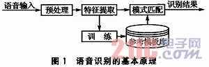 語音識別的基本原理如圖1所示。語音識別包括兩個階段:訓(xùn)練和識別。不管是訓(xùn)練還是識別,都必須對輸入語音預(yù)處理和特征提取。訓(xùn)練階段所做的具體工作是通過用戶輸入若干次訓(xùn)練語音,經(jīng)過預(yù)處理和特征提取后得到特征矢量參數(shù),最后通過特征建模達(dá)到建立訓(xùn)練語音的參考模型庫的目的。而識別階段所做的主要工作是將輸入語音的特征矢量參數(shù)和參考模型庫中的參考模型進(jìn)行相似性度量比較,然后把相似性最高的輸入特征矢量作為識別結(jié)果輸出。這樣,最終就達(dá)到了語音識別的目的。