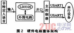 如圖2所示,硬件電路主要包括主控核心部分和語音識別部分。語音進(jìn)入語音識別部分后,將處理過的數(shù)據(jù)并行傳輸?shù)街骺刂破,主控制器?jīng)過處理后,發(fā)送命令數(shù)據(jù)到USART,USART可用于擴展外圍串行設(shè)備,如語音合成模塊等。