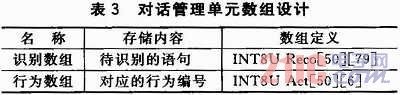 為了方便進(jìn)行對話的管理,本文中設(shè)計了一個對話管理單元,用于對等待識別的語句和等待執(zhí)行的命令進(jìn)行存儲,在主控制器中通過定義二維數(shù)組來實現(xiàn)。LD3320每次識別最多可以設(shè)置50項候選識別句,每個識別句可以是單字、詞組或短句,長度為不超過10個漢字或者79個字節(jié)的拼音串;谏鲜鲈,本文設(shè)計的對話管理數(shù)組如表3所列。