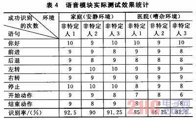 測試中的3個非特定人中,非特定人1為女性,非特定人2和非特定人3為男性。由表中數(shù)據(jù)可以看出,家庭環(huán)境下對非特定人的語音識別率可達(dá)到90%以上,嘈雜的醫(yī)院環(huán)境下的語音識別率也可達(dá)82.5%以上。識別率方面,在嘈雜環(huán)境下比在安靜環(huán)境下的語音識別率有所降低;穩(wěn)定性方面,在安靜環(huán)境下系統(tǒng)的穩(wěn)定性較好,語音說1遍,最多說2遍模塊就可以做出正確的響應(yīng);在噪聲環(huán)境下,系統(tǒng)的穩(wěn)定性有所下降,個別語音命令需要說3遍甚至3遍以上才能被模塊準(zhǔn)確識別;實時性方面,在安靜環(huán)境下的語音能保證系統(tǒng)響應(yīng)的實時性,響應(yīng)時間一般不超過1 s,在噪聲環(huán)境下的響應(yīng)時間相對長一些。