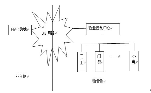 如何實現(xiàn)由業(yè)主決定是否讓來訪者進(jìn)入小區(qū)呢?利用FMC技術(shù)實現(xiàn)小區(qū)的物業(yè)管理(為了敘述方面,簡稱為FMC小區(qū)),就能容易解決。下圖為FMC小區(qū)的拓?fù)浣Y(jié)構(gòu)圖。