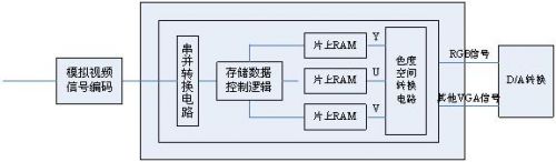 由于YUV信號在模擬信號中是交織著的,所以需要一個信號選擇電路。YUV一共是三路信號,設(shè)計一個計數(shù)器進(jìn)行選擇,計數(shù)是O和2時,是UV信號,計數(shù)是1和3時是Y信號,完成的實際上是串行信號轉(zhuǎn)并行信號的過程。以上過程可以用圖3的原理框圖來表示。