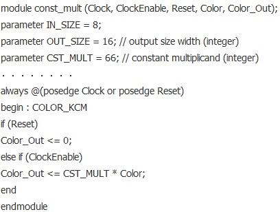 用Verilog HDL編寫代碼,實現(xiàn)YUV到RGB的轉(zhuǎn)化。其中共包括3個模塊跟1個仿真激勵。在模塊const_mult中,主要實現(xiàn)乘法運(yùn)算,主要代碼如下: