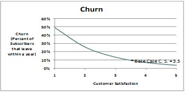 部署智能管道可以在網(wǎng)絡(luò)容量和業(yè)務(wù)保障方面產(chǎn)生積極影響。針對高端用戶提供免溢價(jià)的高價(jià)值服務(wù)/業(yè)務(wù),會提高高端用戶群體的滿意度。高端用戶是高額利潤的保障,是所有運(yùn)營商爭取的目標(biāo),而用戶滿意度是決定他們是否留在網(wǎng)絡(luò)的最重要因素。應(yīng)用智能管道后,預(yù)期年離網(wǎng)率將下降1%~2%。離網(wǎng)率的降低,將使用戶平均停留在本網(wǎng)絡(luò)的周期加長,從而增加收入并減少新用戶的獲取成本。這一部分的價(jià)值和意義,將大于資源合理分配和差異化業(yè)務(wù)的價(jià)值。下面的圖表顯示了離網(wǎng)率和用戶滿意度的關(guān)系。