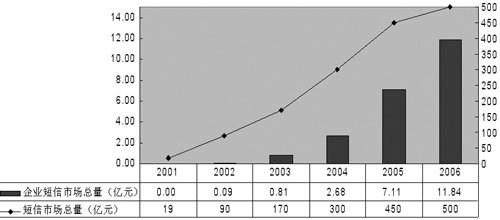有數(shù)據(jù)顯示,2002年企業(yè)短信市場總量為0.09億元,2003年增長到0.81億元,預(yù)計2006年將突破10億元。終于,中國移動和中國聯(lián)通先后推出了面向企業(yè)用戶的“集團短信”業(yè)務(wù),運營商對這個市場的重視使得一個新的產(chǎn)業(yè)鏈逐步完善起來,短信也開始“潤物細無聲”地改變著國內(nèi)企業(yè)的一些習慣。