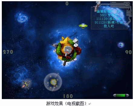 用戶(hù)根據(jù)游戲規(guī)則通過(guò)固定電話(huà)、小靈通和手機(jī)參與《地球保衛(wèi)戰(zhàn)》游戲,就能在短信、語(yǔ)音和電視畫(huà)面提示下完成游戲,觀眾通過(guò)電視就可以看到火爆的游戲畫(huà)面,仿佛如身臨其境;又可以通過(guò)參與游戲獲得積分,贏取大獎(jiǎng)。