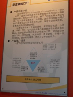 近日,中國電信在西安召開了上半年市場工作會議暨新產(chǎn)品展示專題研討會,在此次會議上,各省電信公司分別展示了自己面向市場開發(fā)的新型業(yè)務(wù)。其中,來自浙江電信的一種叫企業(yè)通信門戶ECP(Enterprise Communications Portal)的主推業(yè)務(wù)在展示過程中吸引了眾多目光,引起了其他與會代表的關(guān)注,被認(rèn)為是中國電信拓展企業(yè)市場空間的最具潛力產(chǎn)品之一。