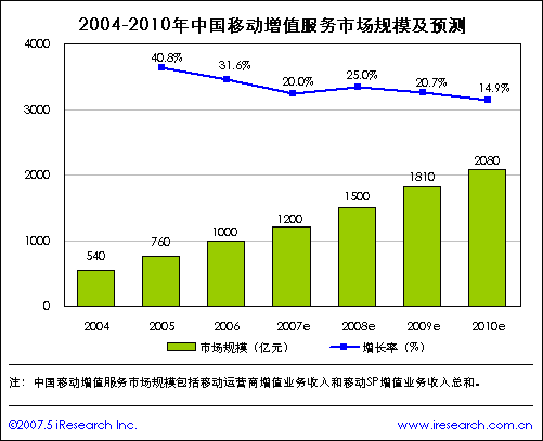 iResearch艾瑞市場(chǎng)咨詢研究成果《2007年移動(dòng)增值研究報(bào)告》顯示,2006年中國(guó)移動(dòng)增值市場(chǎng)規(guī)模達(dá)到了1000億元,比2005年增長(zhǎng)31.6%。隨著市場(chǎng)不斷規(guī)范,中國(guó)移動(dòng)增值市場(chǎng)2007年市場(chǎng)規(guī)模增長(zhǎng)速度將趨于減緩,預(yù)測(cè)2007年中國(guó)移動(dòng)增值市場(chǎng)規(guī)模為1200億元。受2008年奧運(yùn)會(huì)的影響,屆時(shí)中國(guó)移動(dòng)增值市場(chǎng)又會(huì)迎來一個(gè)新的發(fā)展高潮,未來三年中國(guó)移動(dòng)增值市場(chǎng)規(guī)模將繼續(xù)增長(zhǎng),預(yù)計(jì)到2010年中國(guó)移動(dòng)增值市場(chǎng)規(guī)模將達(dá)到2080億元。