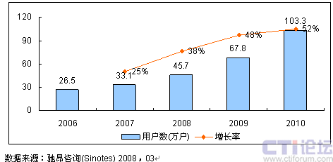 圖1 2008-2010年中國(guó)無(wú)線電郵業(yè)務(wù)用戶(hù)規(guī)模預(yù)測(cè)