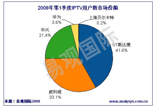 《2008年第1季度中國(guó)IPTV市場(chǎng)季度監(jiān)測(cè)》數(shù)據(jù)顯示,2008年第1季度中國(guó)IPTV累計(jì)用戶數(shù)達(dá)131萬(wàn)人。根據(jù)各廠商中標(biāo)業(yè)務(wù)區(qū)實(shí)際發(fā)展的用戶數(shù)排名,UT斯達(dá)康、威科姆、中興通訊位居前三。2008年第1季度IPTV廠商的競(jìng)爭(zhēng)格局沒有顯著變化。