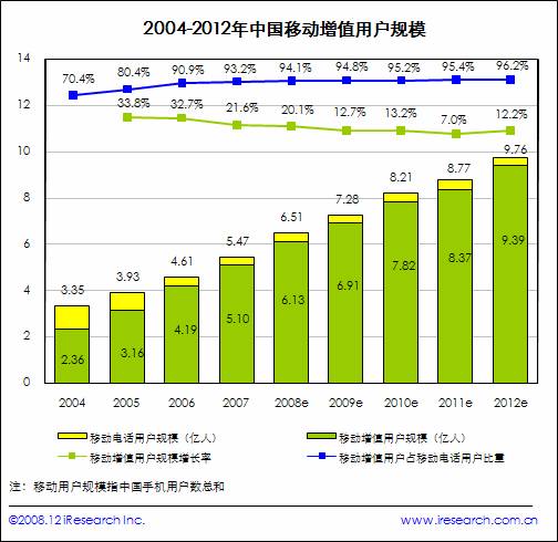 艾瑞咨詢根據(jù)工信部統(tǒng)計的中國移動電話用戶數(shù)量并結(jié)合行業(yè)研究發(fā)現(xiàn),2008年中國移動電話用戶數(shù)將達6.5億,同比增長19.0%,而2008年中國移動增值用戶規(guī)模預(yù)計將達6.13億人,相比2007年的5.10億同比增長20.2%,占中國移動電話用戶規(guī)模的94.1%。預(yù)計到2009年中國移動增值用戶規(guī)模將達到6.91億人,而到2012年將突破9億人。