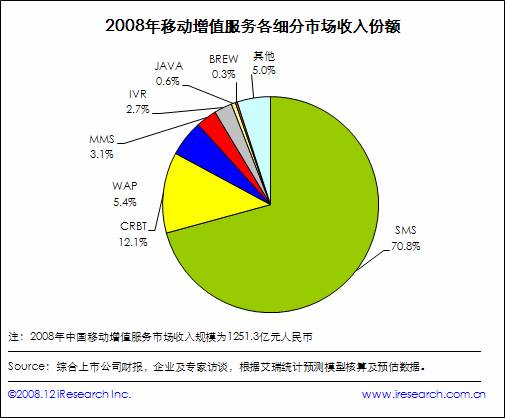 艾瑞研究發(fā)現(xiàn),2008年移動增值服務(wù)細分市場收入中SMS以70.8%的比例占據(jù)主導地位,但其他業(yè)務(wù)對SMS的分流和替代使其增長率有所下降;CRBT、WAP分別以12.1%和5.4%的比例位居第二、第三。