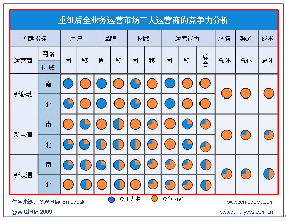 盡管產業(yè)鏈完備程度相差較為明顯,但運營商各自業(yè)務與用戶服務運營能力對3G時常的發(fā)展影響也至關重要,根據易觀國際Enfodesk發(fā)布的《國內運營商3G業(yè)務發(fā)展策略研究系列—中國3G市場現(xiàn)狀與發(fā)展策略概述》報告顯示,在發(fā)展3G的過程中,三大運營商各自有一定的優(yōu)劣勢: