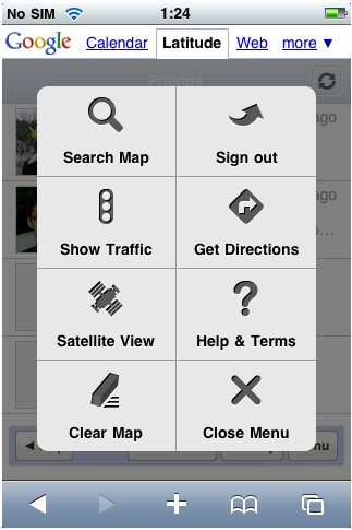 但是我沒(méi)找到在哪里設(shè)置自己的Latitude,就是說(shuō)如果你不想共享自己的位置了怎么辦?想隱藏位置怎么辦?或者iPhone探測(cè)的不準(zhǔn),想手動(dòng)調(diào)節(jié)位置,怎么辦?(當(dāng)然大多數(shù)時(shí)間探測(cè)都是準(zhǔn)的,這個(gè)功能是方便某些人讓別人誤認(rèn)為自己在某個(gè)地方,然后偷偷摸摸的去做別的事情……)這些Phone在網(wǎng)頁(yè)里還做不到,但G1可以,畢竟G1是在Google Maps應(yīng)用里完成Latitude的。