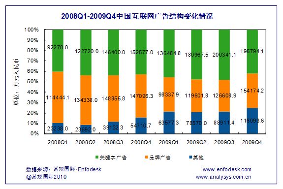品牌廣告則繼續(xù)保持上升趨勢(shì),2009年第4季度,其市場規(guī)模達(dá)到15.4億元,環(huán)比增長21.8%,同比小幅上升4.8%。增長來源主要是快消品、互聯(lián)網(wǎng)產(chǎn)品及服務(wù)以及汽車、通訊行業(yè)等。
