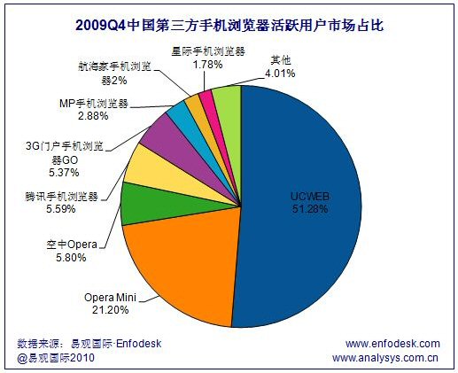 易觀國際(Analysys International)分析認(rèn)為,2009年4季度中國手機瀏覽器市場隨著騰訊、3G門戶等實力強勁的廠商發(fā)力,搶占用戶的市場競爭變得日漸激烈。處于不同手機瀏覽器陣營的廠商都紛紛通過技術(shù)改進(jìn)與大力度的市場營銷廣泛推廣自有產(chǎn)品。