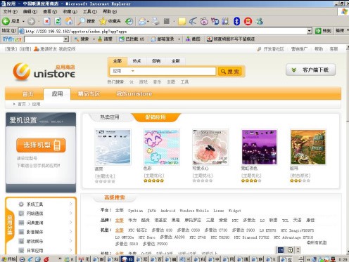 圖:聯(lián)通Unistore手機應(yīng)用商城測試頁面